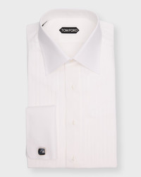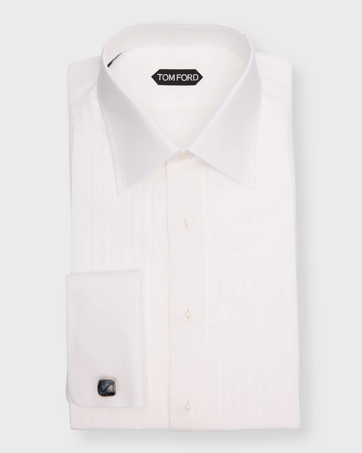 - TOM FORD dress shirt with a pleated front - Point collar; tonal button placket - Long sleeves - French cuffs - Shirttail hem - Cotton - Dry clean - Made in Italy - Model is 6'1"/185cm.