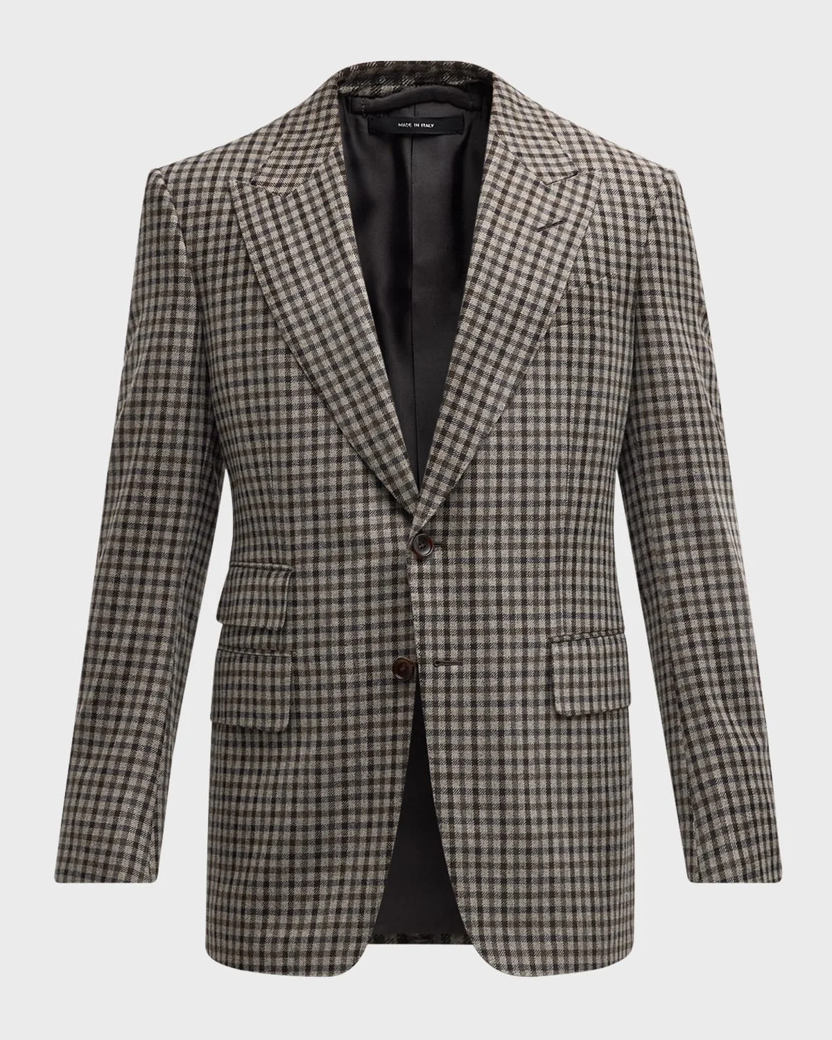 - TOM FORD "Damier Shelton" sport coat in gingham check - Peak lapels - Two-button closure - Chest welt pocket - Side flap pockets and ticket pocket - Unfinished sleeves - Center back vent - Wool/cashmere - Made in Italy - Model is 6'1"/185cm.