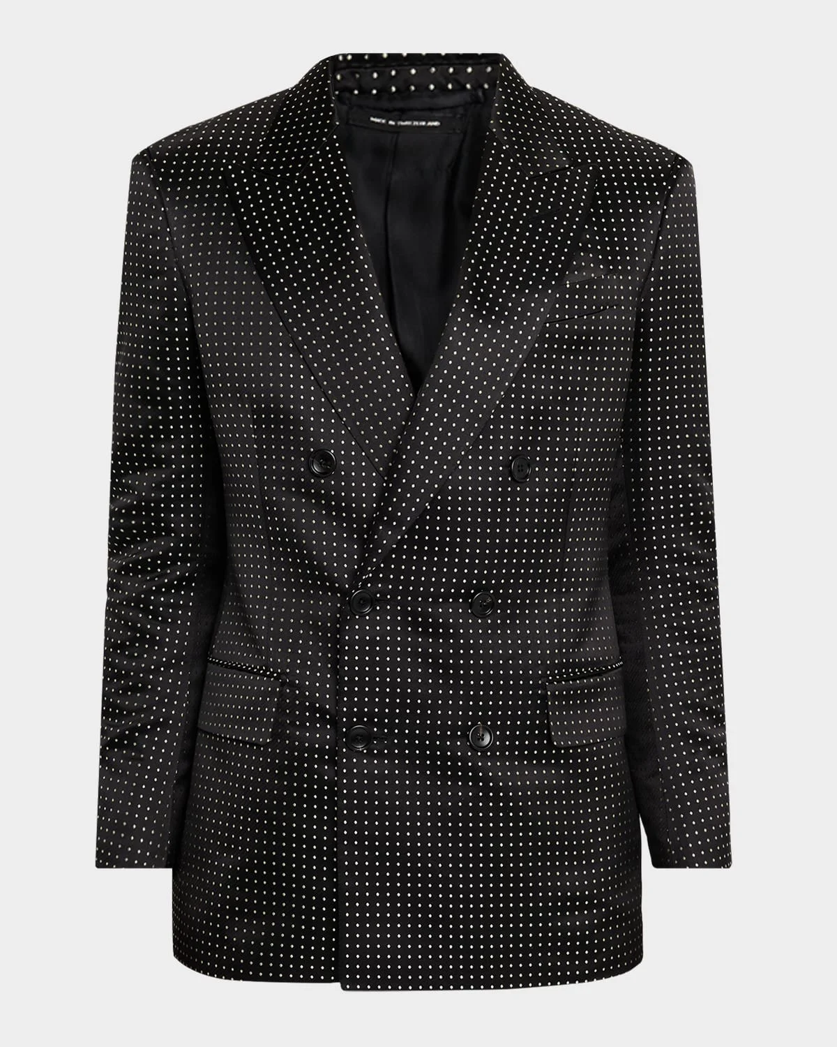 This TOM FORD jacket revives an archival polka dot pattern, reimagined in lustrous mulberry silk jacquard. From Haider Ackermann's first Winter 2025 Fashion Show Peak lapels Doublebreasted front Chest welt pocket Hip flap pockets Fivebutton cuffs Singlevented back Mulberry silk Dry clean Made in Italy