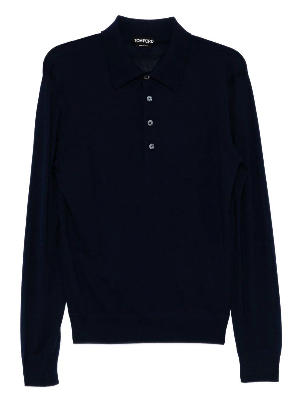 wool polo shirt Highlights - Navy blue - Polo collar - Front button placket - Long sleeves - Ribbed cuffs and hem Made in Italy Composition Wool 100% SIZE & FIT Model measurements Height 6 ft 1 in(1.86 m) Bust/Chest 33.46 in(85 cm) Hips 35.43 in(90 cm) Waist 31.1 in(79 cm) FittingInformation Designed for a regular fit, this polo shirt offers a comfortable loose fit throughout the body Made from a midweight non-stretch fabric Washing instructions Dry Clean Only