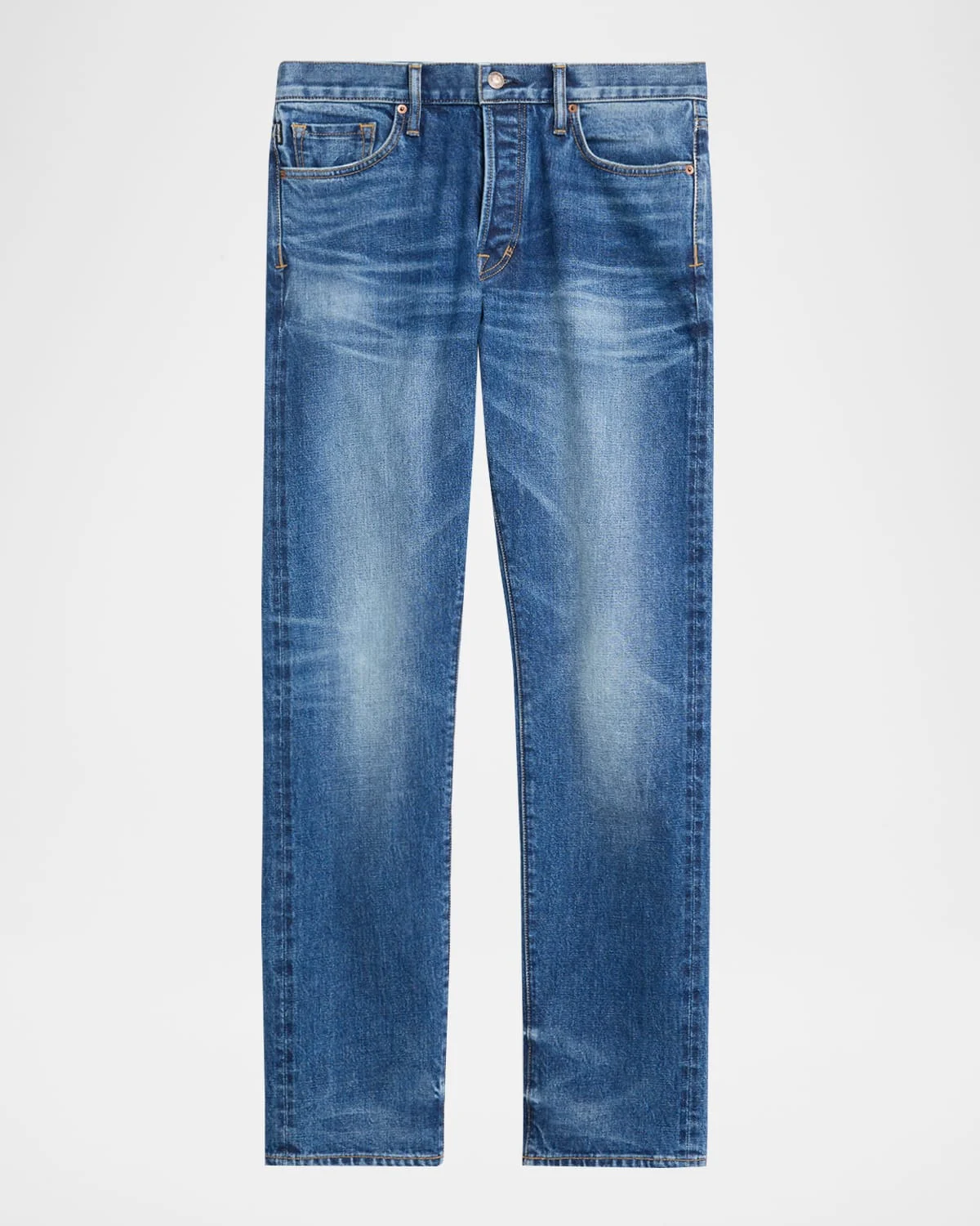 - A slight whiskering details these TOM FORD "Selvedge" jeans. - Regular rise - Five-pocket style - Leather logo patch - Classic fit through straight legs - Full length - Button-zip front; belt loops - Cotton/polyurethane - Made in Italy