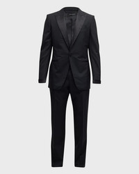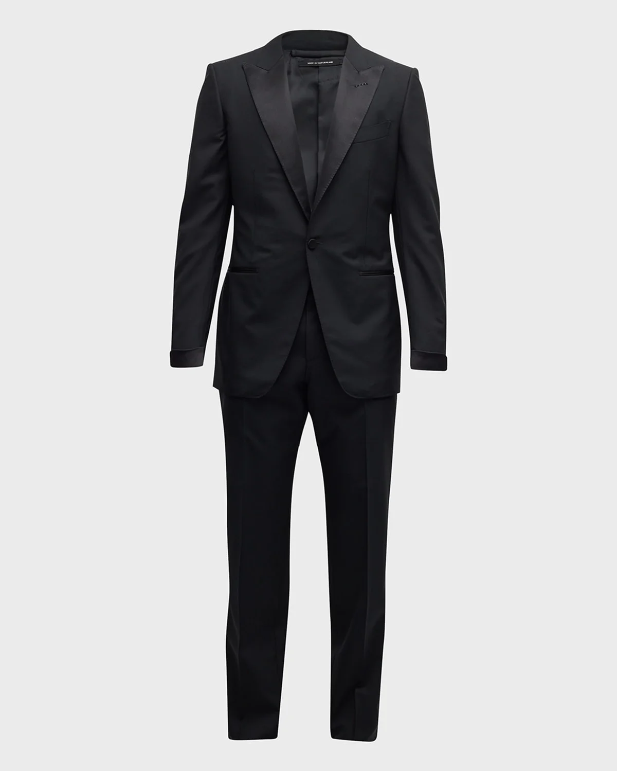- TOM FORD solid tuxedo with satin trim - Peak lapels; single-button front - Chest welt pocket - Jetted side pockets - Rolled cuffs - Double-vented back - Flat-front trousers with side adjusters - Unfinished hem to be tailored to desired length - Modern fit - Wool - Made in Italy - Model is 6'1"/185cm.