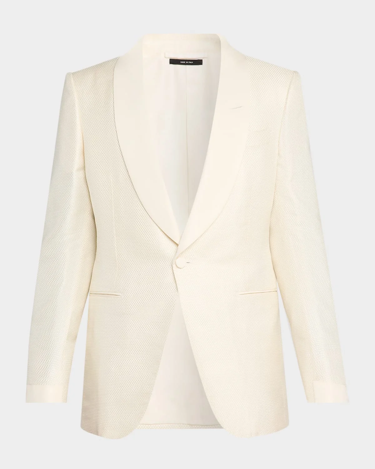 This TOM FORD evening jacket showcases an eyecatching grosgrain jacquard texture with a magnificent sheen. Shawl lapels Singlebreasted front Barchetta chest pocket Hip besom pockets Doublevented back Viscose/spandex Unlined Dry clean, professional cleaning recommended Made in Italy