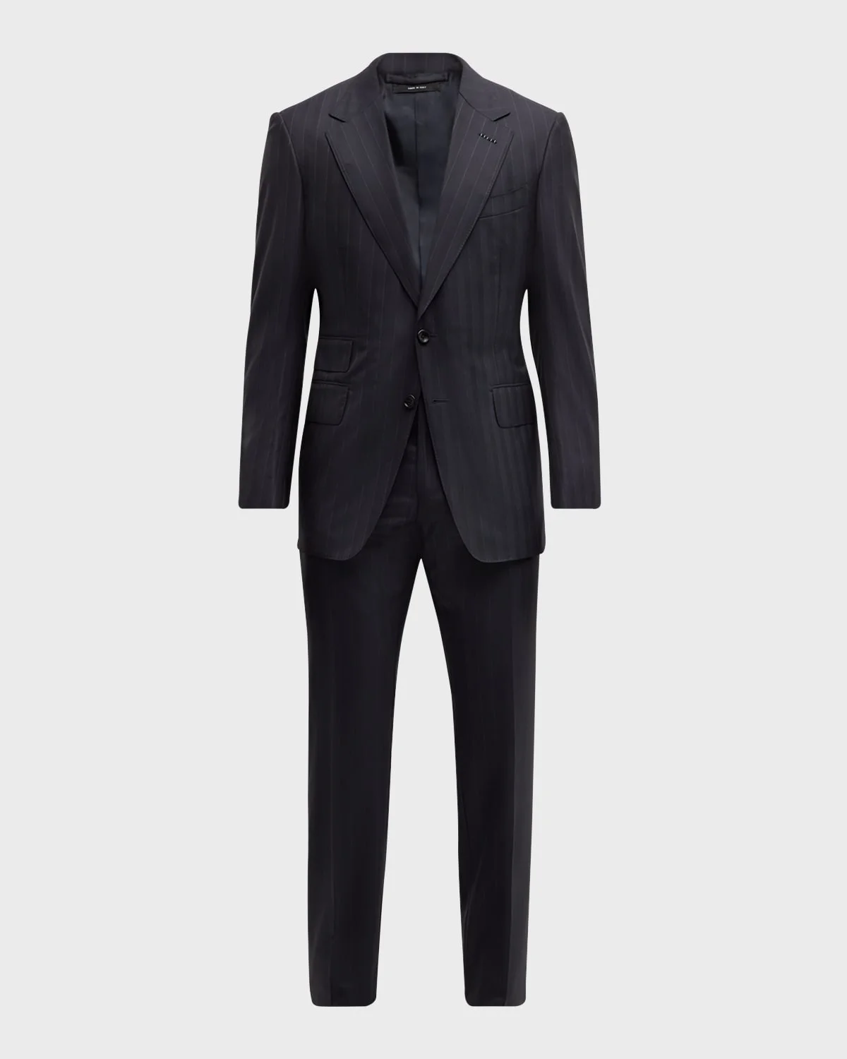 - TOM FORD "Shelton" suit in herringbone stripes - Modern fit - Wool - Lining: Cupro/silk - Made in Italy - Jacket: - Notched lapels; buttonhole at left lapel - Two-button front - Chest welt pocket - Hip flap pockets - Ticket pocket - Unfinished sleeves - Double-vented back - Trousers: - Regular rise - Side adjusters - Flat front - Side on-seam pockets - Full length - Straight legs - Unfinished hem to be tailored to desired length - Model is 6'1"/185cm.