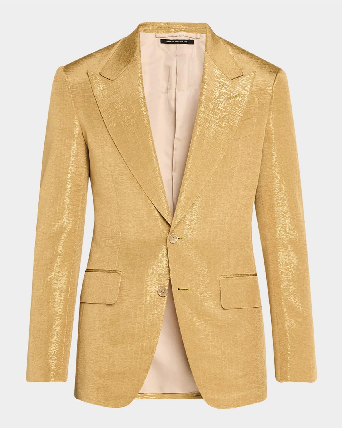 - TOM FORD "Shelton" cocktail jacket in metallic slub moire - Peak lapels - Two-button closure - Chest welt pocket - Hip flap pockets - Five-button sleeve finish - Center back vent - Viscose/cotton - Professional cleaning recommended - Made in Italy - Model is 6'1"/185cm.