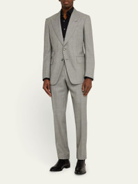TOM FORD Shelton two-piece suit in solid sharkskin weave Slim fit Wool/cashmere/silk Lining: Cupro/silk Made in Italy Jacket: Peak lapels Buttonhole on left lapel Two-button front Chest welt pocket; breast pocket Hip flap pockets; ticket pocket Unfinished sleeves Double-vented back Trousers: Regular rise Extended hook-zip front Side on-seam pockets Side adjuster tabs Full length Model is 6'1"/185cm. Online Inquiries: BGS21_NC98M| Store Inquiries: #4835528