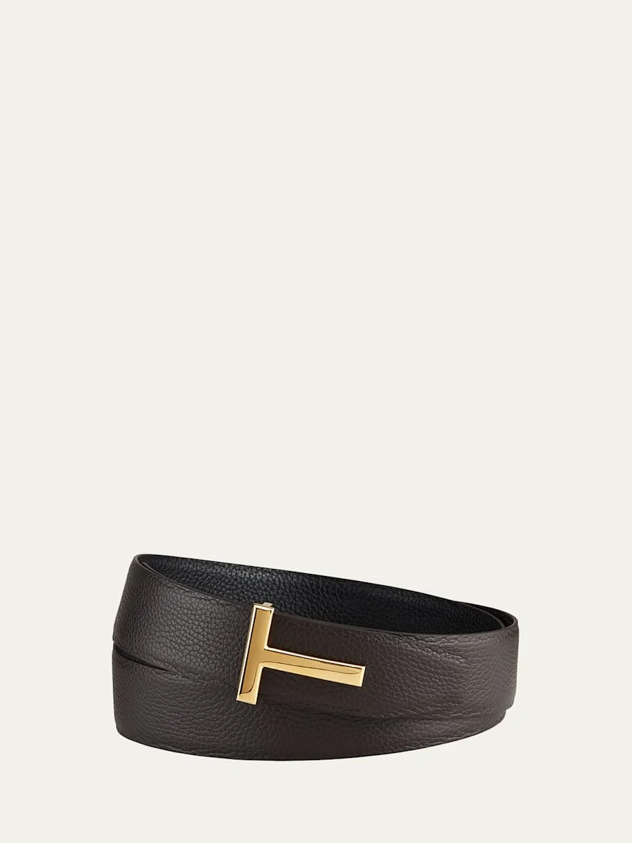 TOM FORD belt in pebble-grain calf leather. Signature T buckle. Golden hardware. Adjustable fit. Made in Italy. Online Inquiries: BGS21_NEVSB| Store Inquiries: #3181070