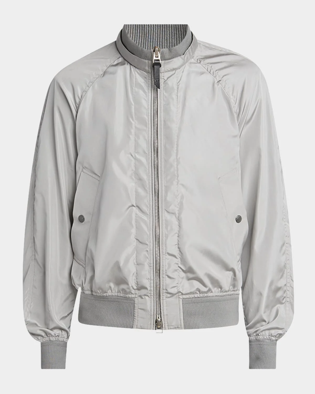 TOM FORD bomber jacket in dyed taffeta for a soft and lustrous finish Highlighted with contrast ribbed trim Stand collar Two-way zip front Side welt pockets Long sleeves Ribbed cuffs and hem Silk Unlined Professional cleaning recommended Made in Italy