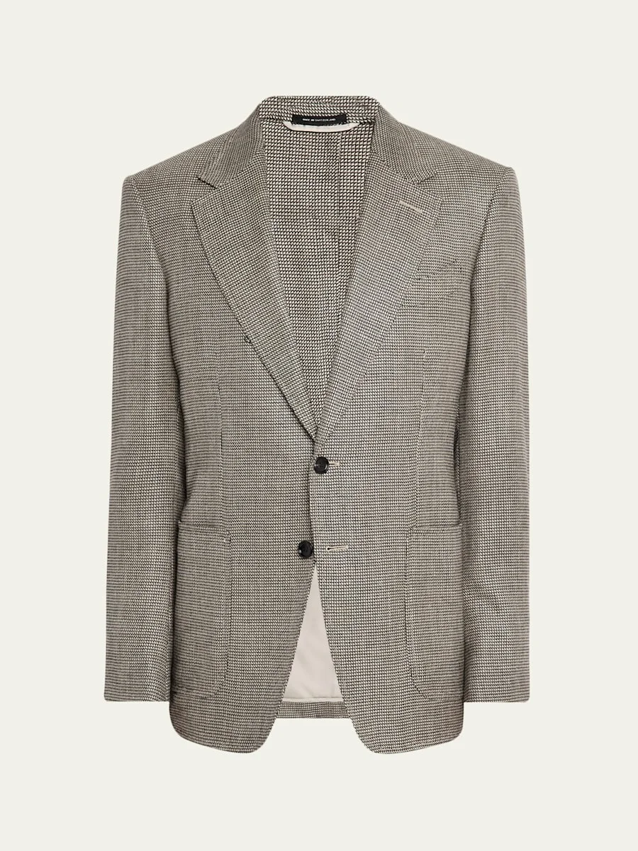 TOM FORD jacket is crafted of a wool-silk blend jacquard Notch lapels; single-breasted front Buttonhole at left lapel Two-button front Long sleeves; unfinished sleeves Chest welt pocket; inner breast pocket Hip patch pockets Tailored fit Virgin wool/silk Wash in professional laundry for leather, protect the buttons in dry cleaning, please address to specialist for leather Made in Italy Online Inquiries: BGS21_NDMYK| Store Inquiries: #5051984