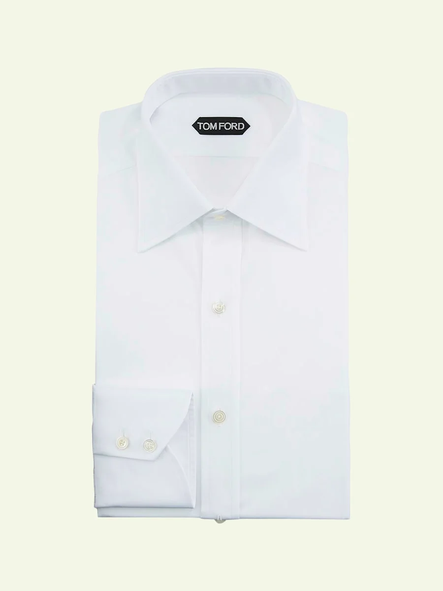 TOM FORD dress shirt in solid poplin. Point collar; button placket. Rounded barrel cuffs. Yoked back. Shirttail hem. Cotton. Made in Italy. Model is 6'1"/185cm. Online Inquiries: BGS21_N68W5| Store Inquiries: #3111301