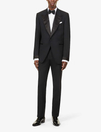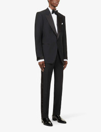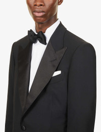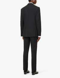 PRODUCT DETAILS - Tom Ford wool-blend suit - 96% wool, 4% elastane; lining 50% silk, 50% cupro; sleevelining 100% cupro - Exposed button fastening at front - Jacket: regular fit, single breasted, peak lapels, long sleeves, unfinished cuffs, welt pocket at chest, two jetted pockets at front, darts at front, dual vents at back, all-over contrasting trims, three internal jetted pockets, fully lined - Unfinished hems, ready for tailoring - Trousers: regular fit, mid-rise, tapered leg, structured waistband, concealed button, hook-and-eye and zip-fly fastening, two buckle-fastened waist adjusters at sides, two slip pockets at front, pressed centre crease at front and back, contrast panels at sides, darts at back, two buttoned jetted pockets at back, all-over contrasting trims - Unfinished hems, ready for tailoring - Specialist dry clean only - Made in Italy - Jacket size UK 40: length 33in / 84cm, chest 40in / 102cm - Trousers size UK 40: rise 14in / 36cm, inside leg 37in / 94cm, leg opening 14in / 36cm - Model is 6ft 2in/1.88m and wears a size UK 40 - Midweight, slight stretch - Please note that altered garments cannot be returned in-store or online. Ref: R03944825