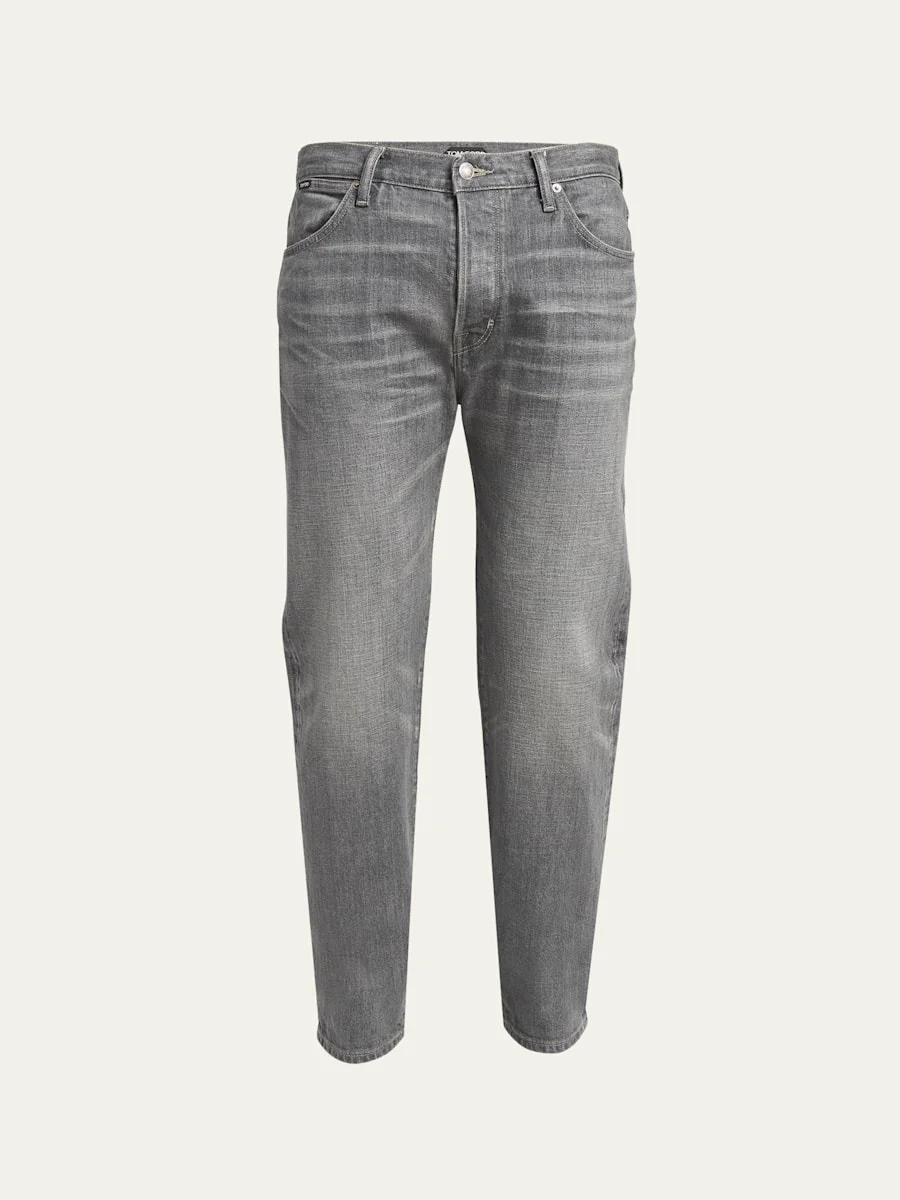 TOM FORD jeans in comfort-stretch denim Button-zip front; belt loops Regular rise Flat front Five-pocket style Leather logo patch at back Straight legs Full length Cotton/polyurethane Lining: Cotton/leather/polyester Made in Italy Model is 6'1"/185cm. Online Inquiries: BGS21_NB7GB| Store Inquiries: #4598158