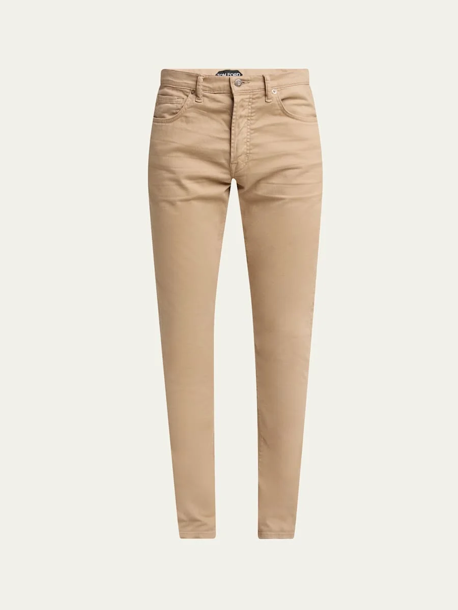 The cotton and spandex twill for these TOM FORD pants allows for a slim fit with stretch. Regular rise Five-pocket style Leather logo patch Slim fit Full length Button-zip front; belt loops Cotton/elastane Made in Italy Online Inquiries: BGS21_NDN15| Store Inquiries: #5052096