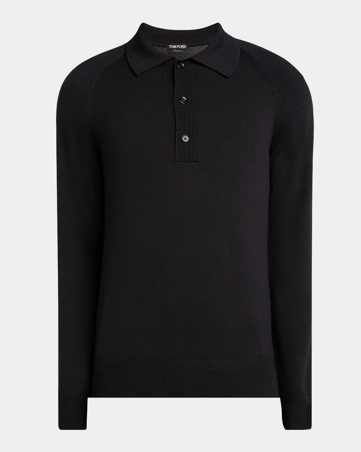 - TOM FORD solid knit polo shirt in wool and silk - Spread collar - Three-button placket - Raglan sleeves - Ribbed cuffs and hem - Pullover style - Viscose/wool/silk - Professional cleaning recommended - Made in Italy