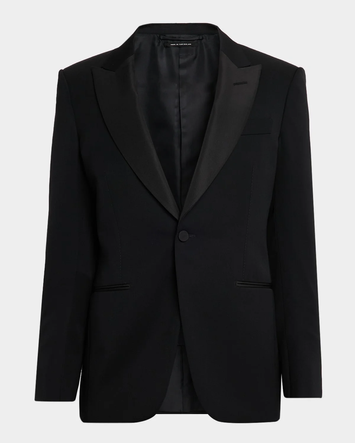 This TOM FORD evening jacket is crafted from Japanese grain de poudre, characterized by a fine, grainy texture and a matte finish. Satin peak lapels Singlebreasted front Chest welt pocket Hip besom pockets Internal breast pocket Doublevented back Wool Dry clean Made in Italy