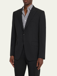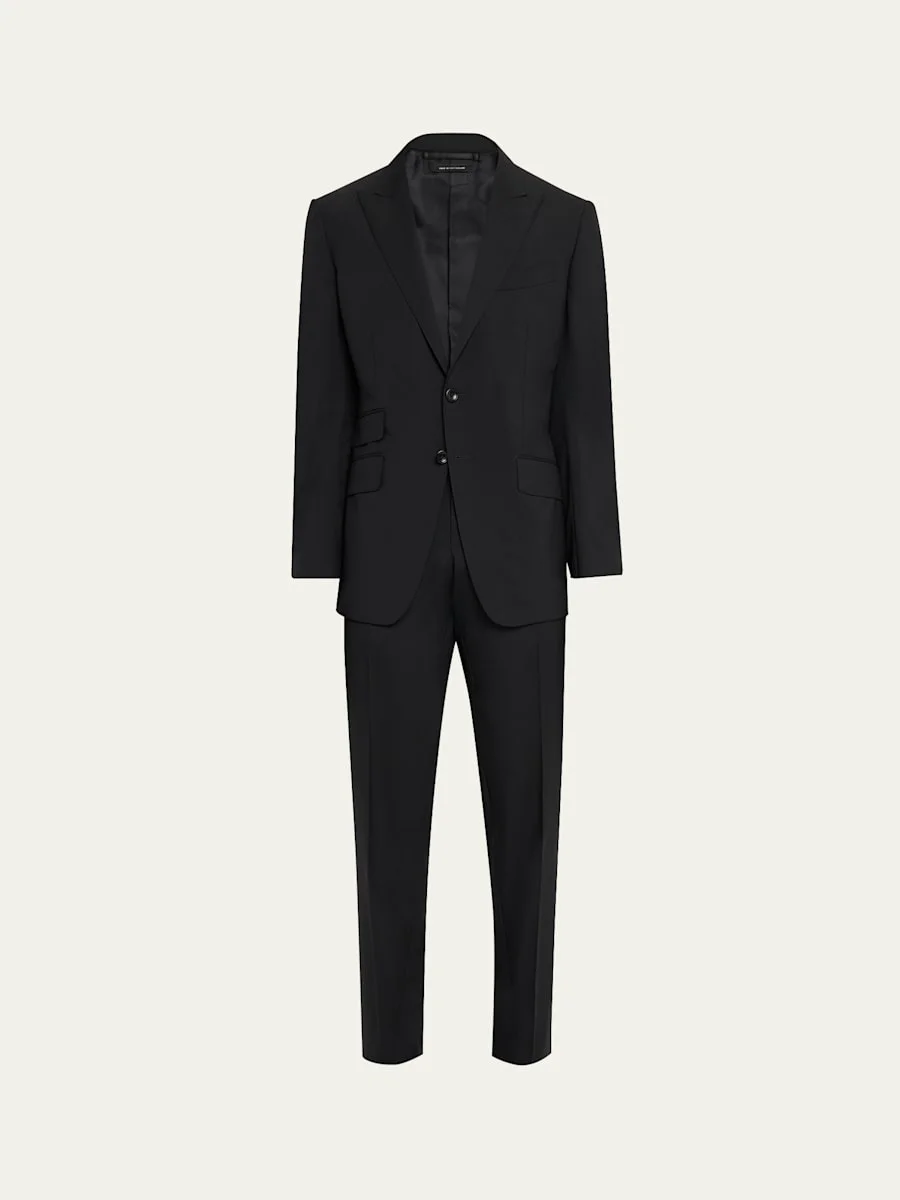 TOM FORD two-piece suit in premium wool resulting in a sleek and modern finish Wool Lining: Cotton/cupro/silk Made in Italy Jacket: Peak lapels Single-breasted front Chest welt pocket Hip flap pockets; ticket pocket Long sleeves Pants: Regular rise Creased front Straight legs Unfinished hem to be tailored to desired length Online Inquiries: BGS21_NC4T6| Store Inquiries: #4806972