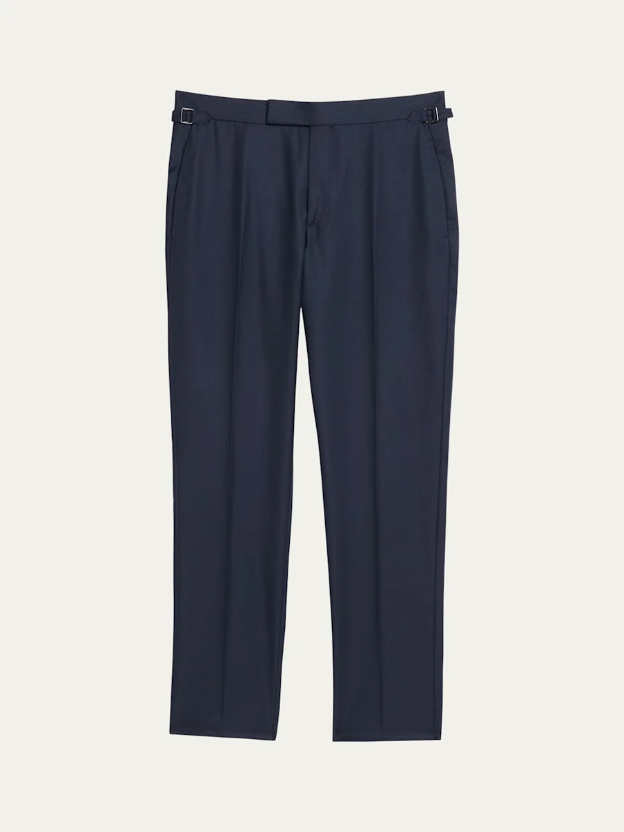 TOM FORD pants in wool sharkskin elevated with side adjusters for a comfortable fit Regular rise Flat front Side slip pockets Buttoned back besom pockets Classic fit through straight legs Extended button-zip front; belt loops Full length Wool Made in Italy Proposition 65 warning for California residents Online Inquiries: BGS21_NDMY8| Store Inquiries: #5051973