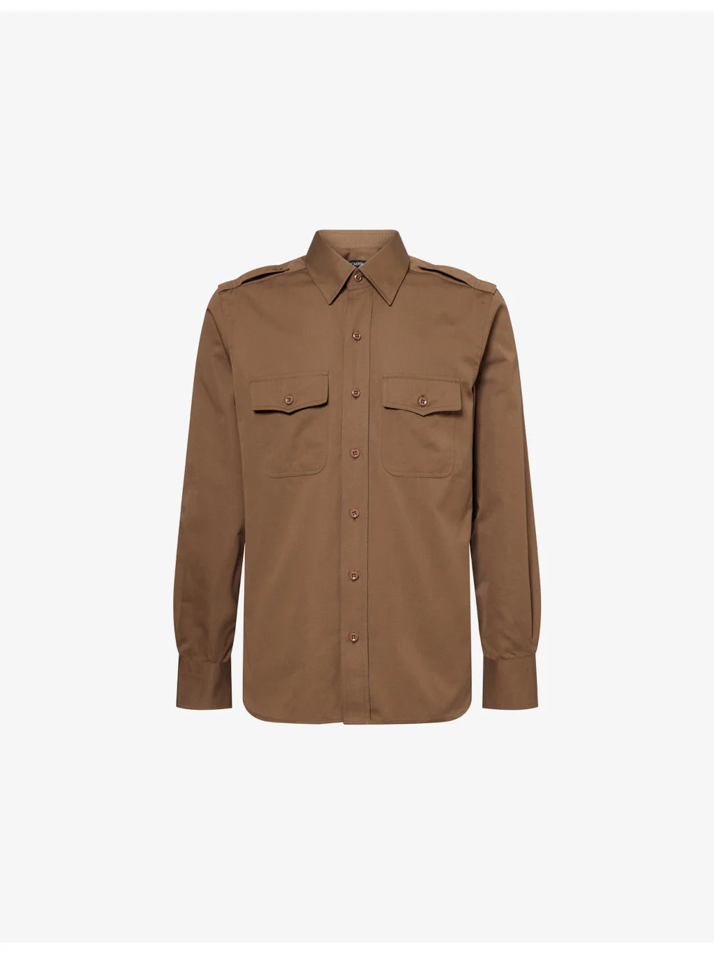 PRODUCT DETAILS - Tom Ford cotton-silk blend shirt - 92% cotton, 8% silk - Exposed button fastening at front - Regular-fit, pointed collar, long sleeves, buttoned cuffs, two patch pockets at chest, curved hem - Dry clean only - Made in Italy - Size UK 39: length 29.1in / 74cm, chest 45.2in / 108cm - Model is 6ft 2in/1.88m and wears a size UK 38 - Lightweight, non-stretch Ref: R04476853