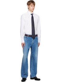 Woven silk tie. · Jacquard stripes throughout · Keeper loop at back face · W3" Supplier color: Navy 100% silk. Made in Italy 252076M158004