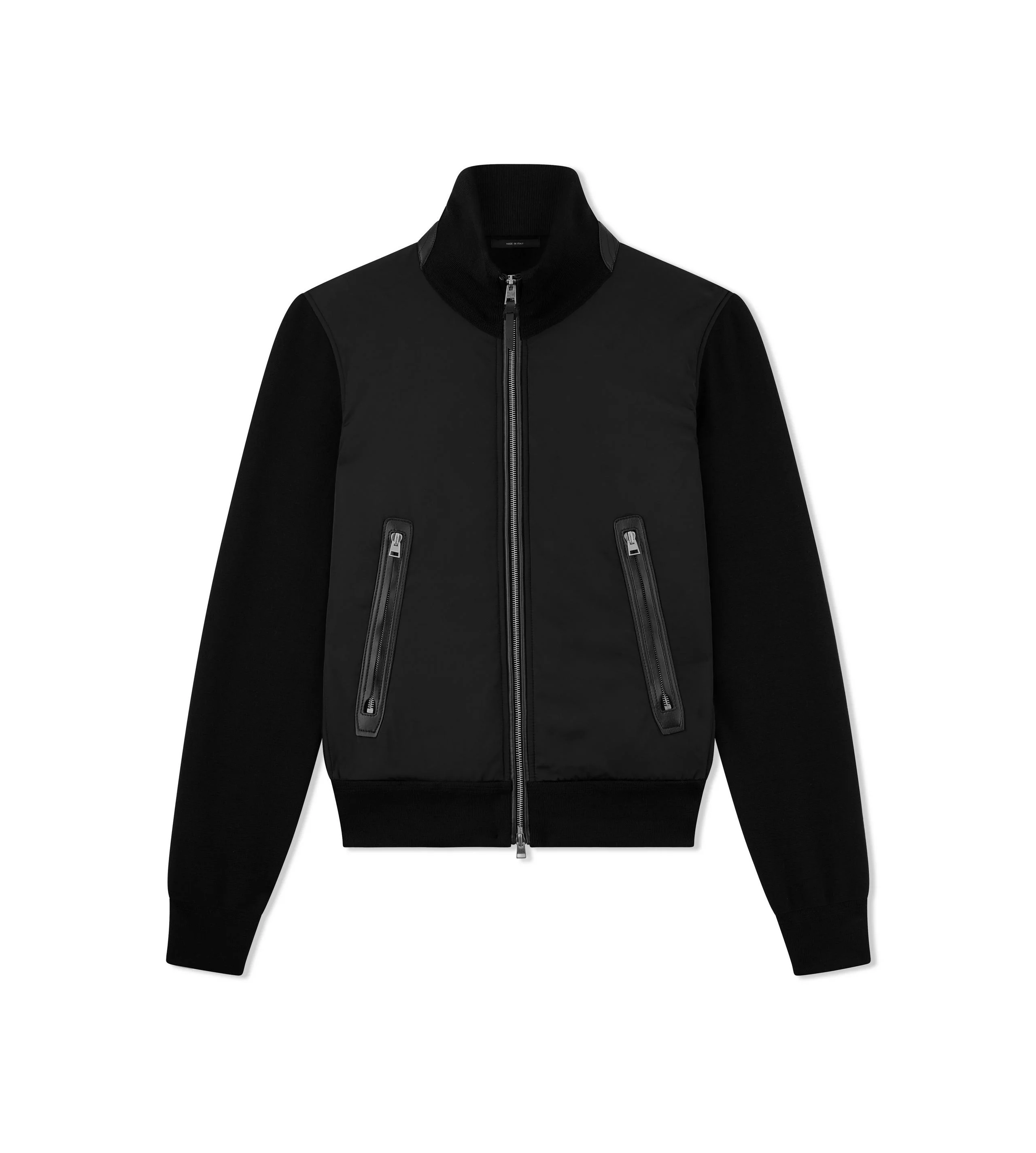 - ZIP THROUGH BLOUSON - OVATTA LIGHT-FILL FRONT (POLYESTER LIGHT PADDED FILL) - LIGHTWEIGHT AND SPORTY APPERANCE - SMOOTH LEATHER DETAILING - INTERLOCK JERSEY STITCH - 18 GAUGE - 100% EXTRA FINE MERINO, 100% POLYESTER FRONT - MADE IN ITALY