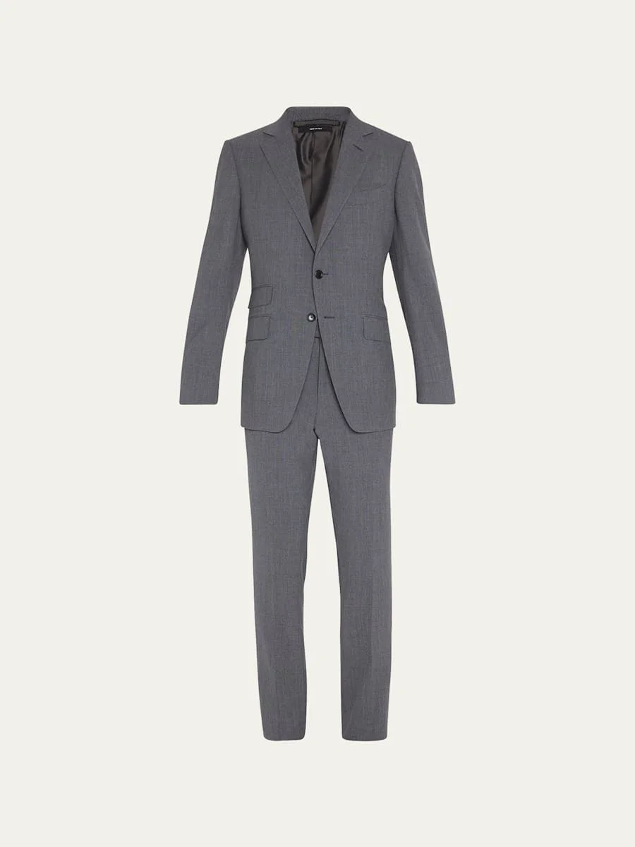 TOM FORD "O'Connor" solid suit Notched lapels; two-button front Chest welt pocket Side flap pockets Basted sleeves Double-vented back Flat-front trousers Modern fit Wool Made in Italy Model is 6'1"/185cm. Online Inquiries: BGS21_N93LV| Store Inquiries: #4279482