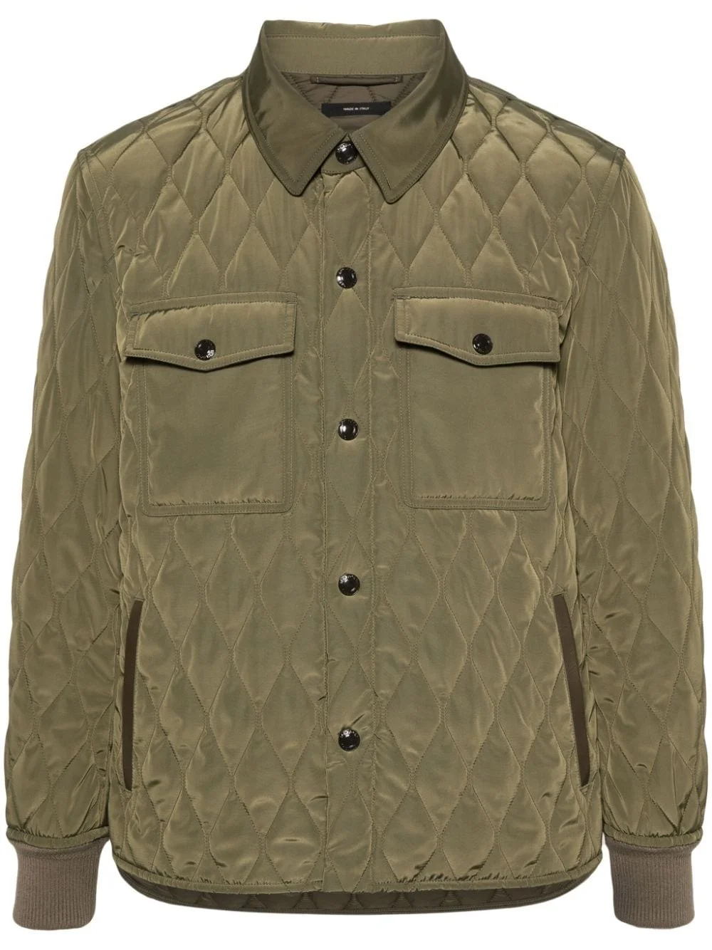 padded quilted jacket This khaki TOM FORD jacket strikes a fine balance between the functionality of a hunting silhouette and the refinement of lustrous satin. It’s diamond-quilted to evenly distribute the insulating padding and kitted with flap chest pockets that stay true to its functional roots. Highlights - Khaki - Satin finish - Padded design - Diamond quilting - Classic collar - Long sleeves - Ribbed cuffs - Two chest flap pockets - Two side inset pockets - Two internal slip pockets - High-low hem - Front press-stud fastening Made in Italy Composition Outer: Polyester 100% Lining: Polyamide 100% SIZE & FIT Model measurements Height 6 ft 1 in(1.86 m) Bust/Chest 36.61 in(93 cm) Hips 37 in(94 cm) Waist 28.74 in(73 cm) FittingInformation Designed for a regular fit, allowing for a comfortably loose fit throughout the body Made from a quilted non-stretch fabric, giving it no natural elasticity This piece fits true to size – take your usual size Washing instructions Dry Clean Only