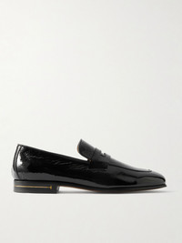 TOM FORD's 'Gigi' penny loafers will add a bit of personality to your formal attire. In a versatile black shade, they've been made in Italy from crackled patent-leather and feature signature gold-tone 'T's along the heels. Size & Fit - Fits true to size. Take your normal size - European sizing Details & Care - Black crackled patent-leather (Lamb)