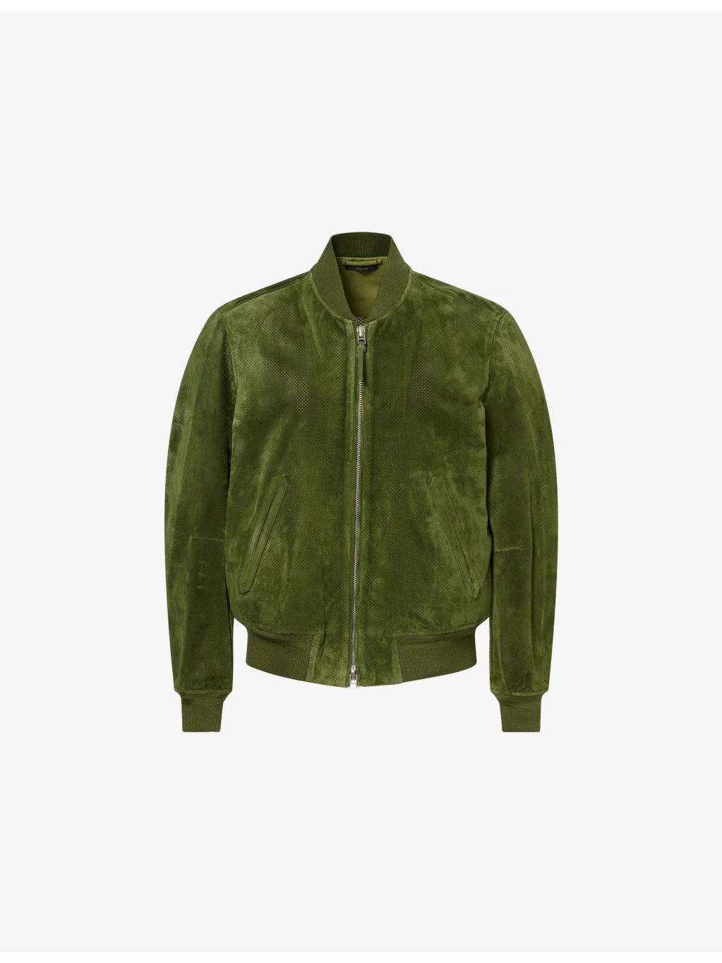 PRODUCT DETAILS - Tom Ford suede bomber jacket - 100% leather; trims 90% cotton, 8% polyamide, 2% elastane - Zip fastening - Regular fit, flat collar, welt pockets at front, ribbed trims, perforated suede exterior, unlined - Specialist leather clean - Made in Italy - Size UK 40: chest 46in / 117cm, length 25in / 63.5cm - Model is 6ft 3in/1.91m and wears a size UK 40 - Midweight, non-stretch Ref: R04607578
