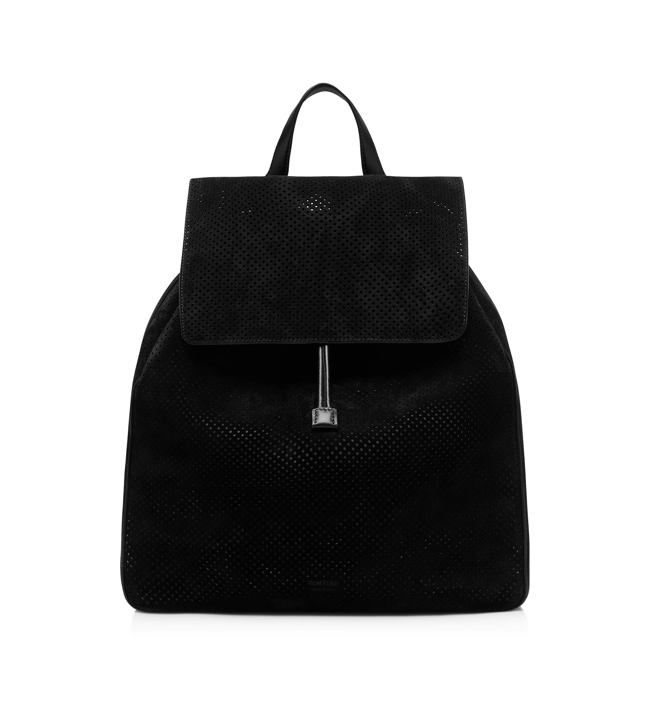 PRODUCT NO: 5955291197 The TOM FORD T-Line backpack is crafted in perforated cashmere suede, defined by soft structure and elegance, with a flap closure and 100% palladium brass galvanization details. Composition: 100% calf leather Made in Italy
