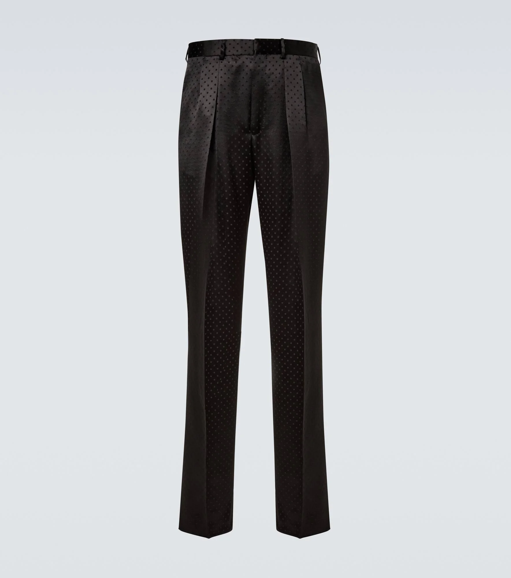Tom Ford’s tailoring showcases meticulous attention to detail with a dose of high-octane glamour. Made from satin, these suit pants are characterized by all-over tonal polka dots. Product Details - Material: 60% viscose, 40% silk - Care instructions: dry clean - Made in Italy - Designer color name: Black - Item color: black - Lining: 100% cupro - Pocket lining: 70% cotton, 20% viscose, 10% modal - Closure: zipper fly, button and hook fastenings - Pockets: side slit pockets, back pockets - Item number: P01066581 Size & Fit - True to size - Non-stretchy fabric - Straight leg - Unhemmed for tailoring - The model in the picture is 185cm-6'1" and wearing a size 50