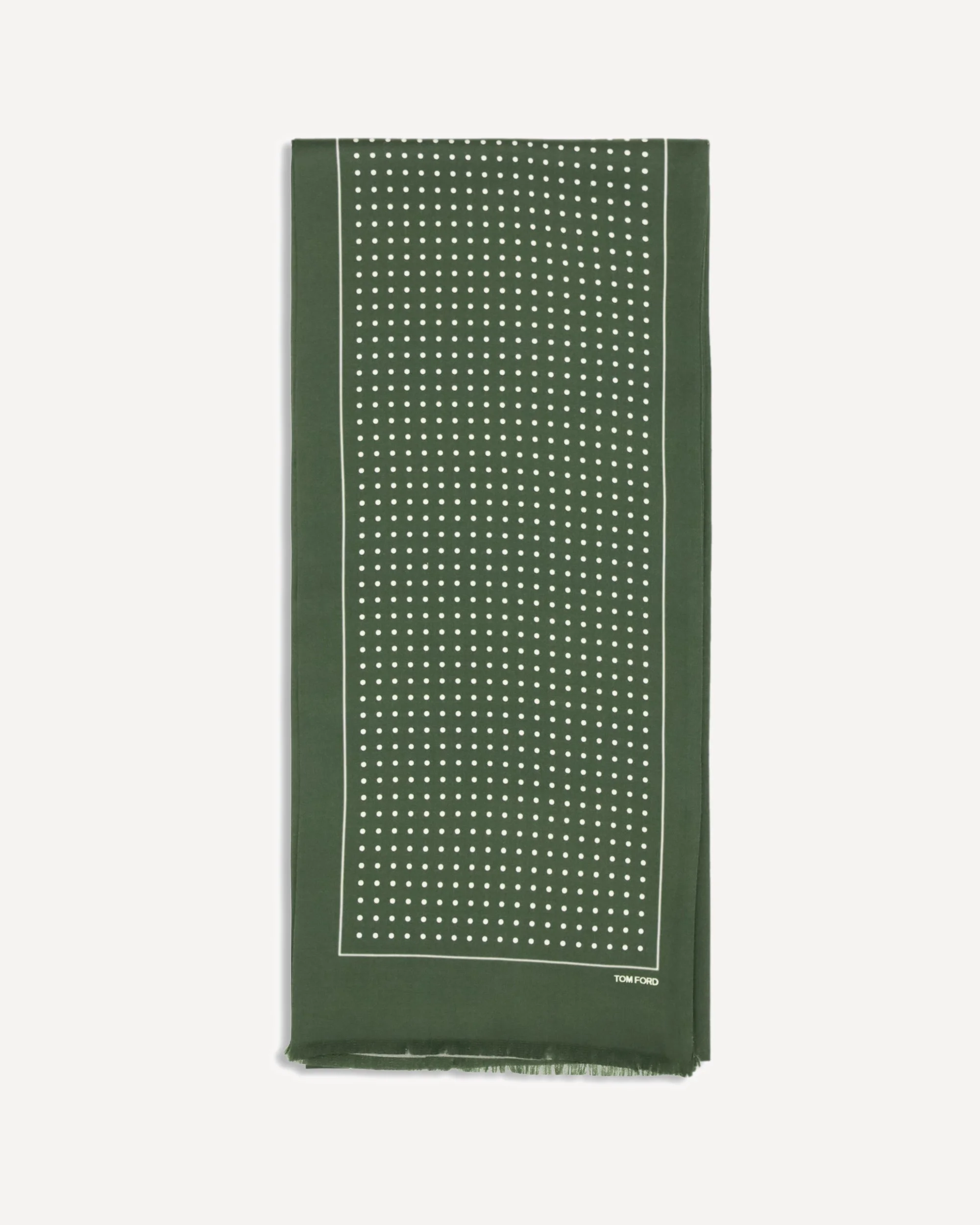 The polka dot Scarf by Tom Ford is made of silk and stands out for its rectangular shape and elegant design. Finished with frayed edges, it is completed by the logo positioned at the bottom, adding a discreet and refined detail to the model. DETAILS - Sku: SSD027S0199_GAV - Season: SS26 - Composition: GENERAL 100% Silk - MADE IN ITALY