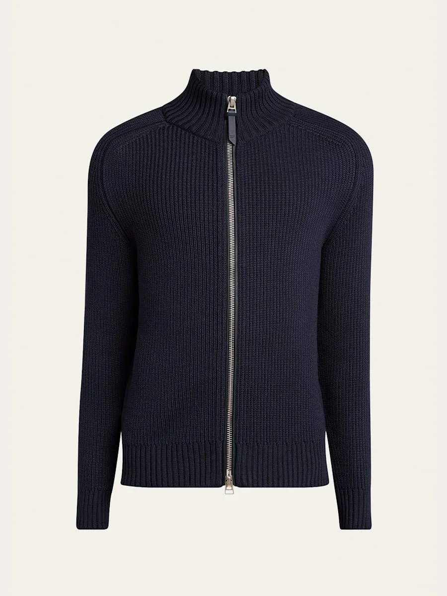 TOM FORD full-zip sweater in ribbed viscose Stand collar Two-way zip front Long sleeves Ribbed cuffs and hem Viscose Professional cleaning recommended Made in Italy Online Inquiries: BGS21_NCK43| Store Inquiries: #4896495