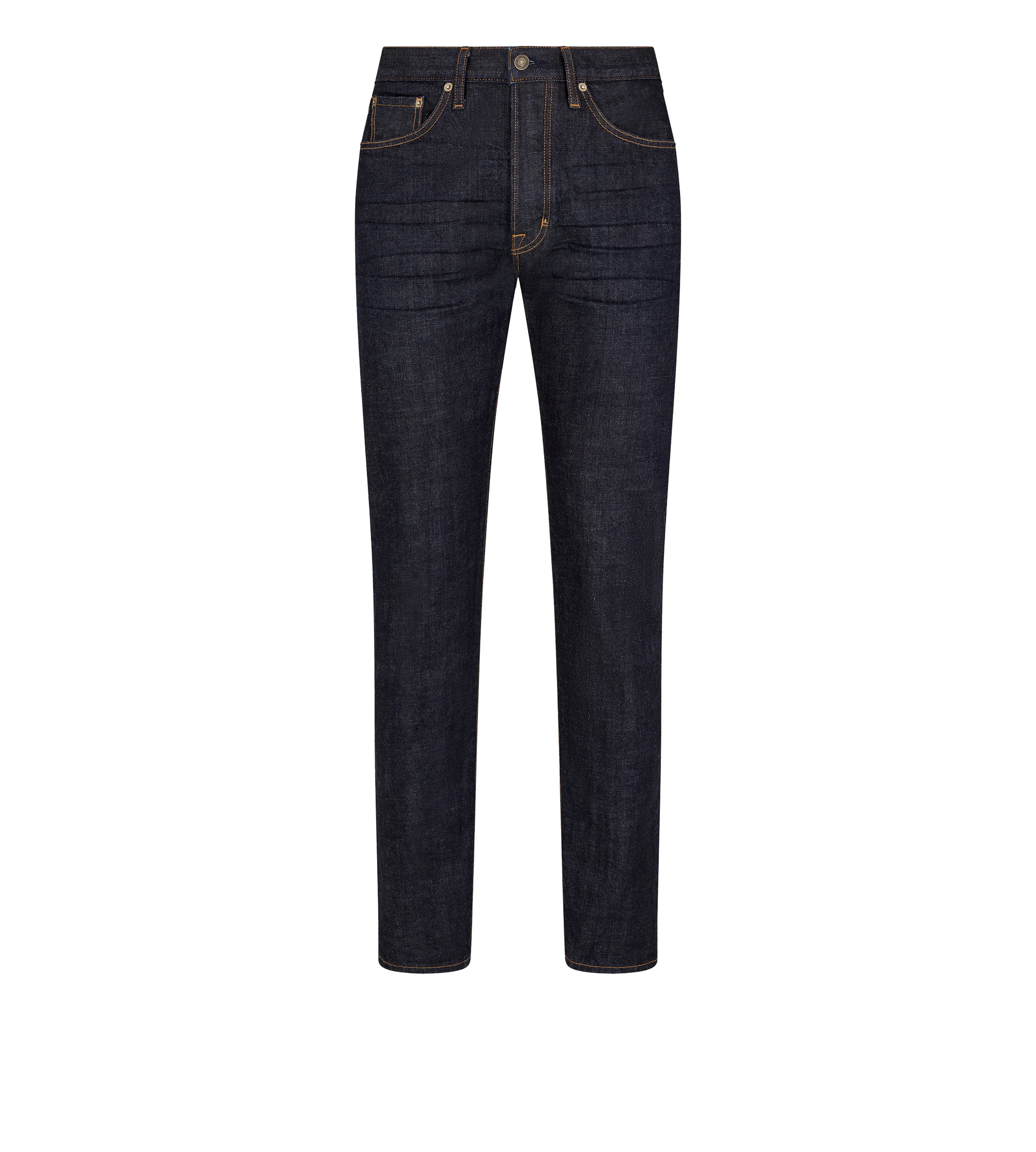 - STANDARD FIT - TOM FORD SIGNATURE TACK BUTTON CLOSURE AND RIVETS - COIN POCKET ON FRONT RIGHT WITH TOM FORD LABEL - T BARTACK ON BUTTON FLY AND HIPS - TOM FORD LEATHER BACK TAB - 18.3CM HEM - MADE IN USA - 100% COTTON - MADE IN USA