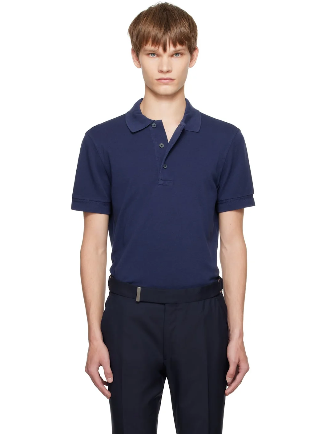 Lyocell- and cotton-blend pique polo. · Rib-knit spread collar and cuffs · Three-button placket · Logo embroidered at front hem · Tennis-tail hem Supplier color: Bright navy 67% lyocell, 33% cotton. Made in Portugal 252076M212003