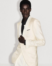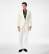PRODUCT NO: JEMHG1-VSP11 A sculpted evening piece with a refined jacquard texture and shawl lapel, embodying TOM FORD formal attire. Composition: 61% Viscose, 39% Silk Made in Italy