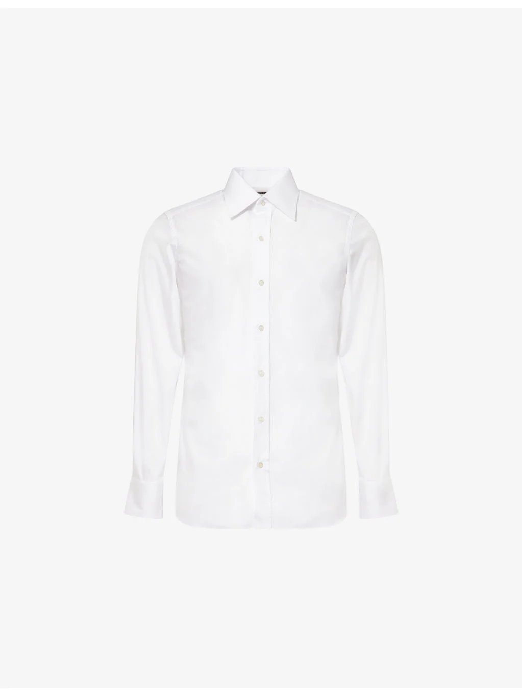 PRODUCT DETAILS - Tom Ford cotton-poplin shirt - 100% cotton - Exposed button fastening at front - Spread collar - Buttoned cuffs - Slim fit, collar, long sleeves, straight yoke at back, curved hem - Machine wash at 40°C - Made in Italy - Size 15.5: length 30in / 76cm, chest 40in / 102cm - Model is 6ft 2in / 1.88m and wears a collar size 15.5 - Lightweight, stretchy Ref: R04550772