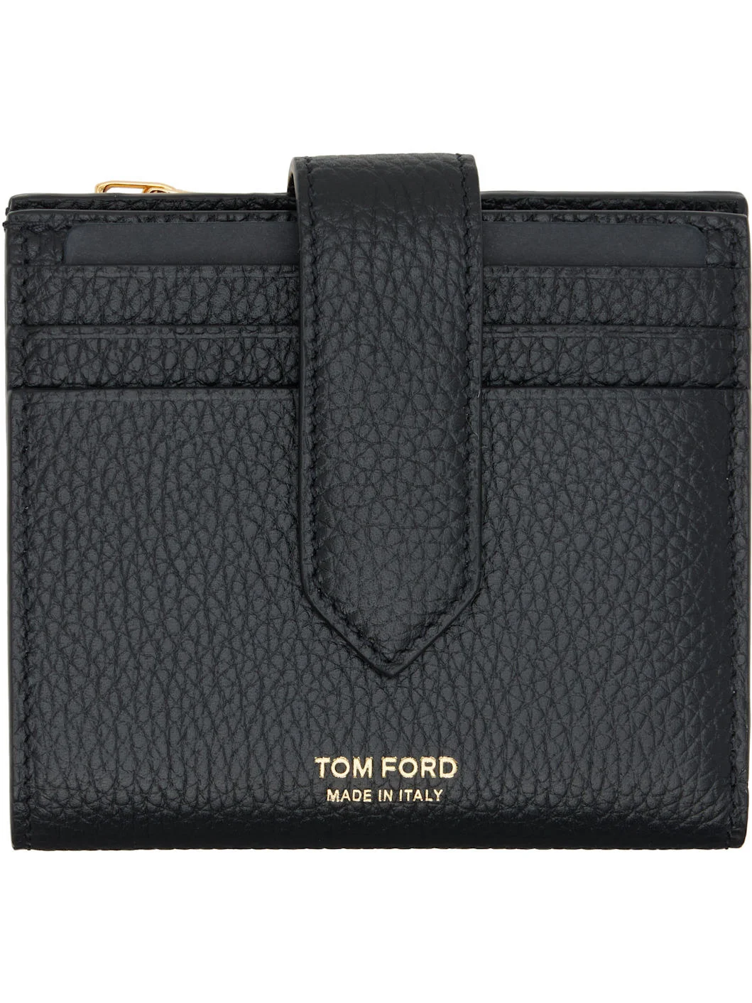 Grained leather bifold wallet. · Logo stamp at face · Zip coin compartment at back face · Press-stud closure · Ten card slots · One patch pocket · One note slot · H3.75" x W4" x D0.75" Supplier color: Black Leather. Made in Italy 252076M164006