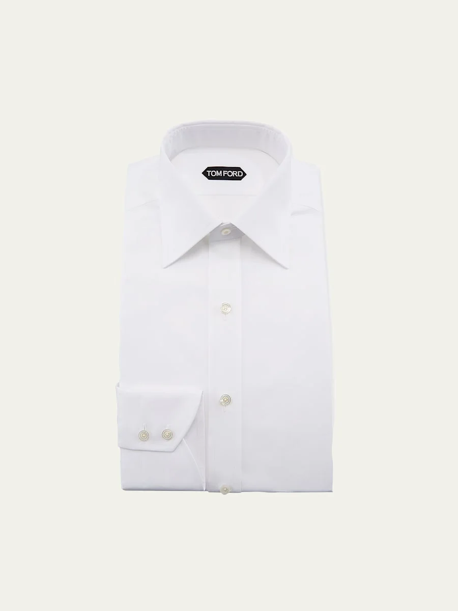 Tom Ford solid dress shirt. Spread collar; button front. Double barrel cuffs. Classic fit. Shirttail hem. Cotton; machine wash. Made in Switzerland. Model is 6'1"/185cm. Online Inquiries: BGS21_N52P3| Store Inquiries: #2277055