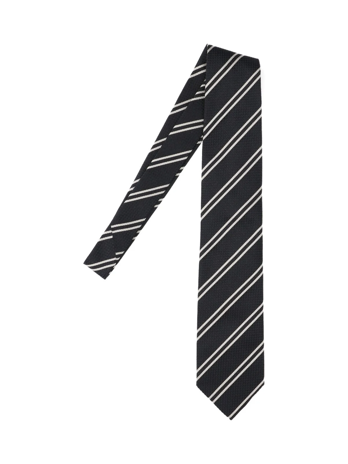 TOM FORD STRIPED TIE IN BLACK MULBERRY SILK WITH WHITE DETAILS, ADJUSTABLE. PRODUCT INFO PRODUCT CODE STE001 S0229NAA COMPOSITION: 100% MULBERRY SILK MADE IN: ITALY
