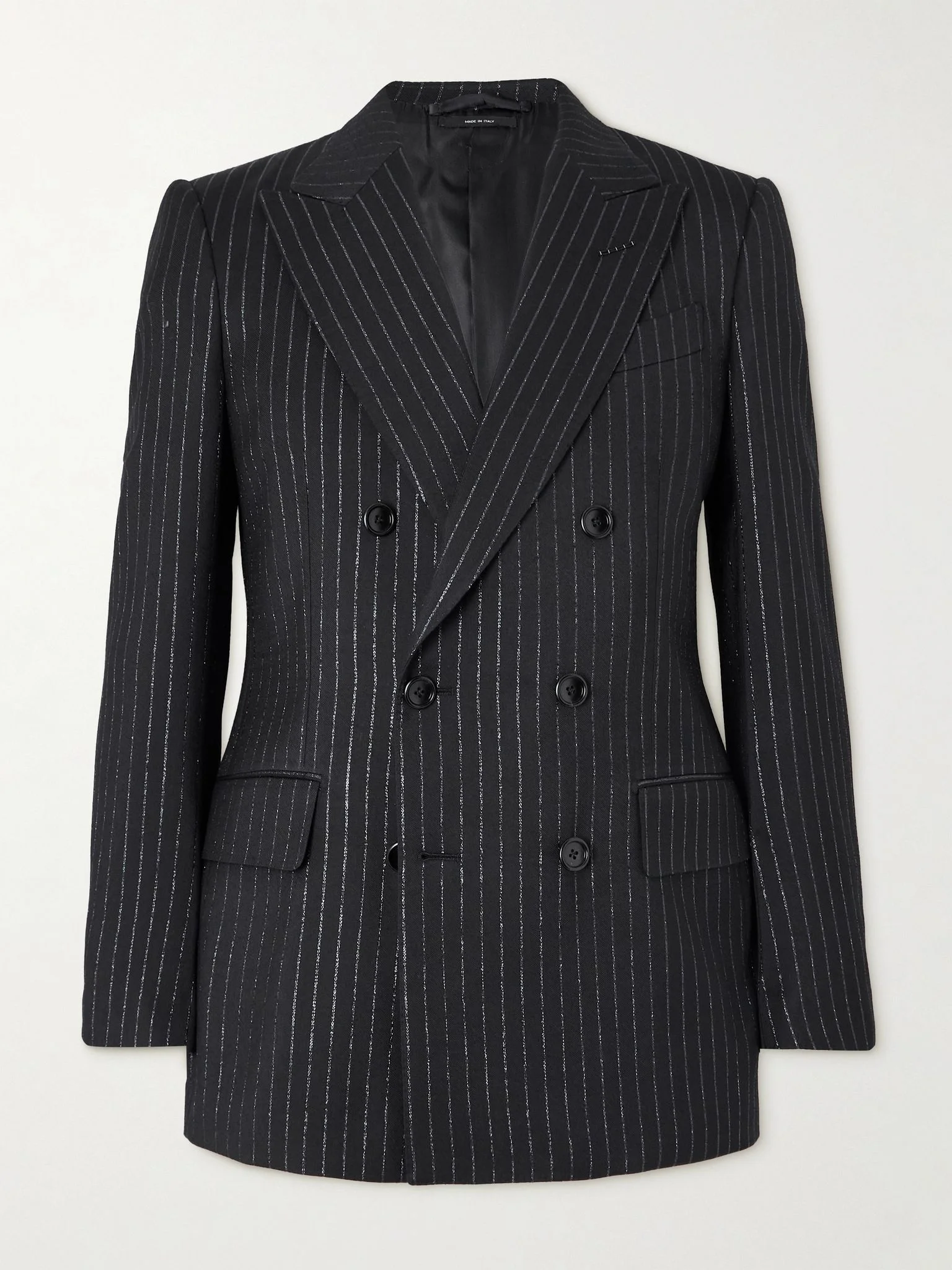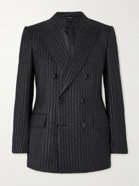 Tailoring is always a standout of TOM FORD's collections. This ‘Dyllan’ suit jacket is cut from a wool and silk-blend with a double-breasted front, wide peak lapels and a single vent to prevent creasing when seated. The metallic stripes add a touch of dimension. Size & Fit - Fits true to size. Take your normal size - Regular cut blazer, tailored for a comfortable fit - Internal shoulder pads - Mid-weight, non-stretchy fabric - Model is shown wearing an IT 48 - Model measures: chest 38"/ 96cm, height 6'1"/ 185cm Details & Care - Black and metallic wool and silk-blend - Peak lapels, padded shoulders, functioning buttoned cuffs, chest welt pocket, two front flap pockets, single vent, two internal pockets, fully lined - Double-breasted button fastenings - 78% wool, 20% silk, 2% metallic fibre; buttons: 100% horn (Buffalo); lining1: 59% cupro, 41% silk; lining2: 100% cupro - Dry clean