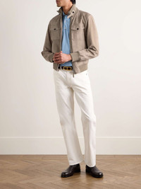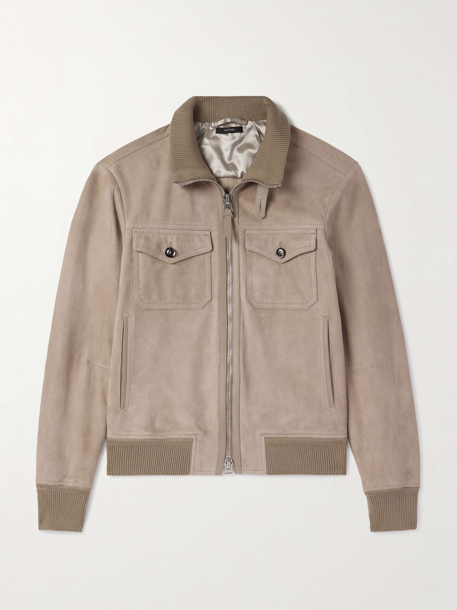 TOM FORD's bomber jacket is made from supple suede, which will only get softer with age. It's detailed with a variety of pockets, a throat latch and a contrasting ribbed-knit collar and hem. Size & Fit - Fits small to size. Take one seize larger than normal - Designed for a slim fit - Ribbed hem - Supple, non-stretchy suede - Model is shown wearing an IT 48 - Model measures: chest 36"/ 92cm, height 6'2"/ 188cm Details & Care - Taupe suede - Two-way zip fastening - 100% suede (Lamb) - Specialist clean