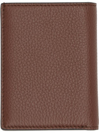 Pebble-grained calfskin bifold card holder. · Gold-tone logo stamp at face · Six card slots at interior · Moire lining · H4" x W3" x D0.25" Supplier color: Mid brown Calfskin. Made in Italy 252076M163000