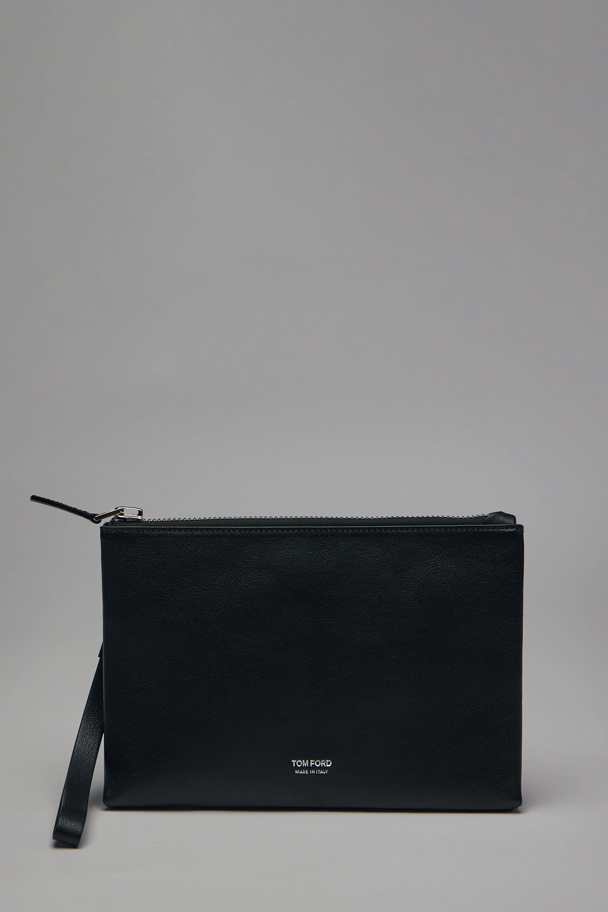 SKU: 154323 Pouch featuring a sleek, minimalist design with a detachable wrist strap. Crafted from high-quality leather, this pouch provides a luxurious feel and is perfect for carrying essentials securely. - Black leather material - Detachable wrist strap - Top zipper closure - Polished hardware - Textured surface - Compact and lightweight - Brand logo embossed Materials: 100% Leather Color: Black