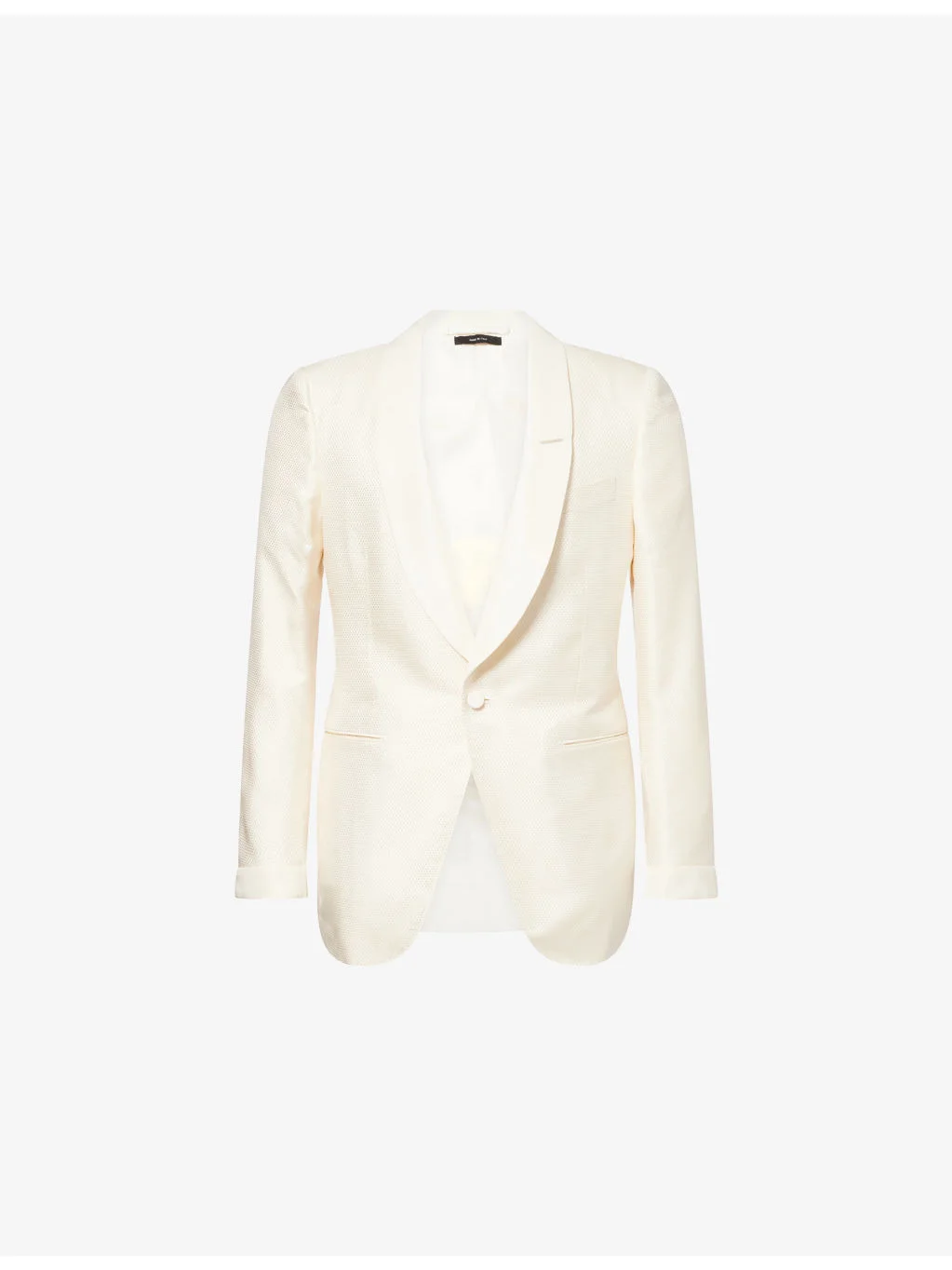 PRODUCT DETAILS - Tom Ford woven blazer - 61% viscose, 39% silk; lining 59% cupro, 41% silk; sleevelining 100% cupro - Exposed button fastening at front - Regular fit, single-breasted, shawl lapels, padded shoulders, long sleeves, welt pocket and two jetted pockets at front, textured, satin-twill trims, fully lined, double vent - Dry clean - Made in Italy - Size UK 40: length 30in / 76cm, chest 38in / 97cm - Model is 6ft 2in/1.88m and wears a size UK 40 - Midweight, slight stretch Ref: R04550688