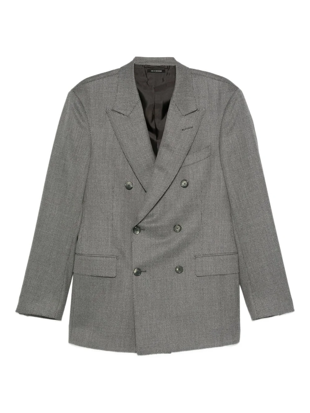 double-breasted wool blazer Highlights - Grey - Wool - Double-breasted closure - Peak lapels - Six button fastening - Front flap pockets Imported Composition Lining: Cupro 100% Outer: Wool 100% SIZE & FIT Model measurements Height 6 ft 0 in(1.84 m) Bust/Chest 35.82 in(91 cm) Hips 37 in(94 cm) Waist 28.34 in(72 cm) Washing instructions Read Manufacturer Guidelines
