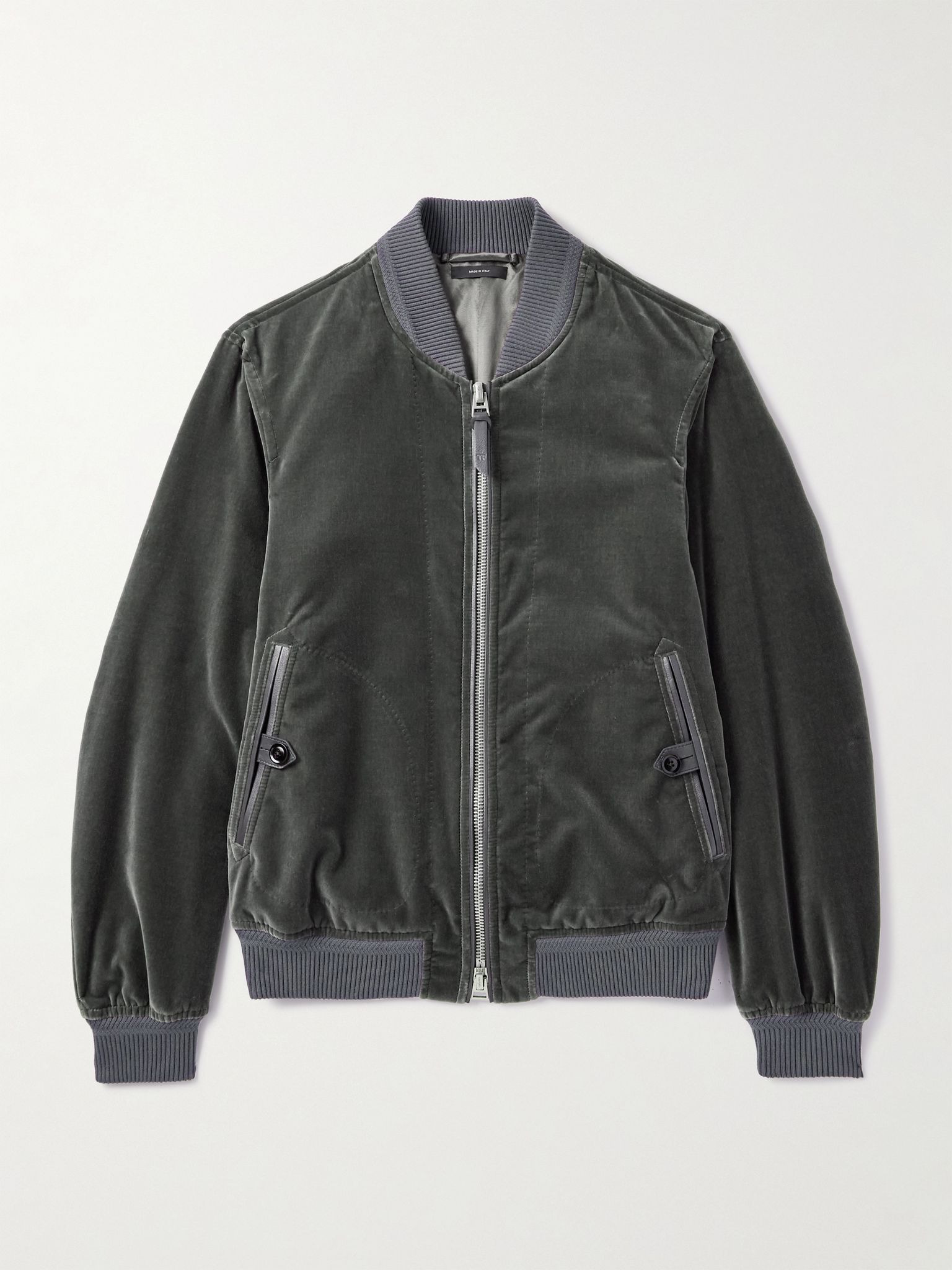 TOM FORD's bomber jacket is crafted from plush cotton-velvet that saturates colour so well, making the shade so much richer. Made in Italy, it's cut for a comfortable fit and has tonal ribbed trims. Size & Fit - Those who are above 6'1"/ 185cm may wish to take the next size up - Designed for a regular fit - Ribbed hem - Mid-weight, slightly stretchy fabric - Model is shown wearing an IT 50 - Model measures: chest 38"/ 96cm, height 6'3"/ 191cm Details & Care - Grey-green cotton-velvet, grey cotton-blend - Two-way zip fastening - 100% cotton; trim1: 90% cotton, 8% polyamide, 2% elastane; trim2: 100% leather (Calf); buttons: 100% horn (Buffalo); lining1: 56% cotton, 44% viscose; lining2: 61% cupro, 39% viscose - Fully lined - Dry clean