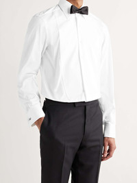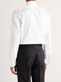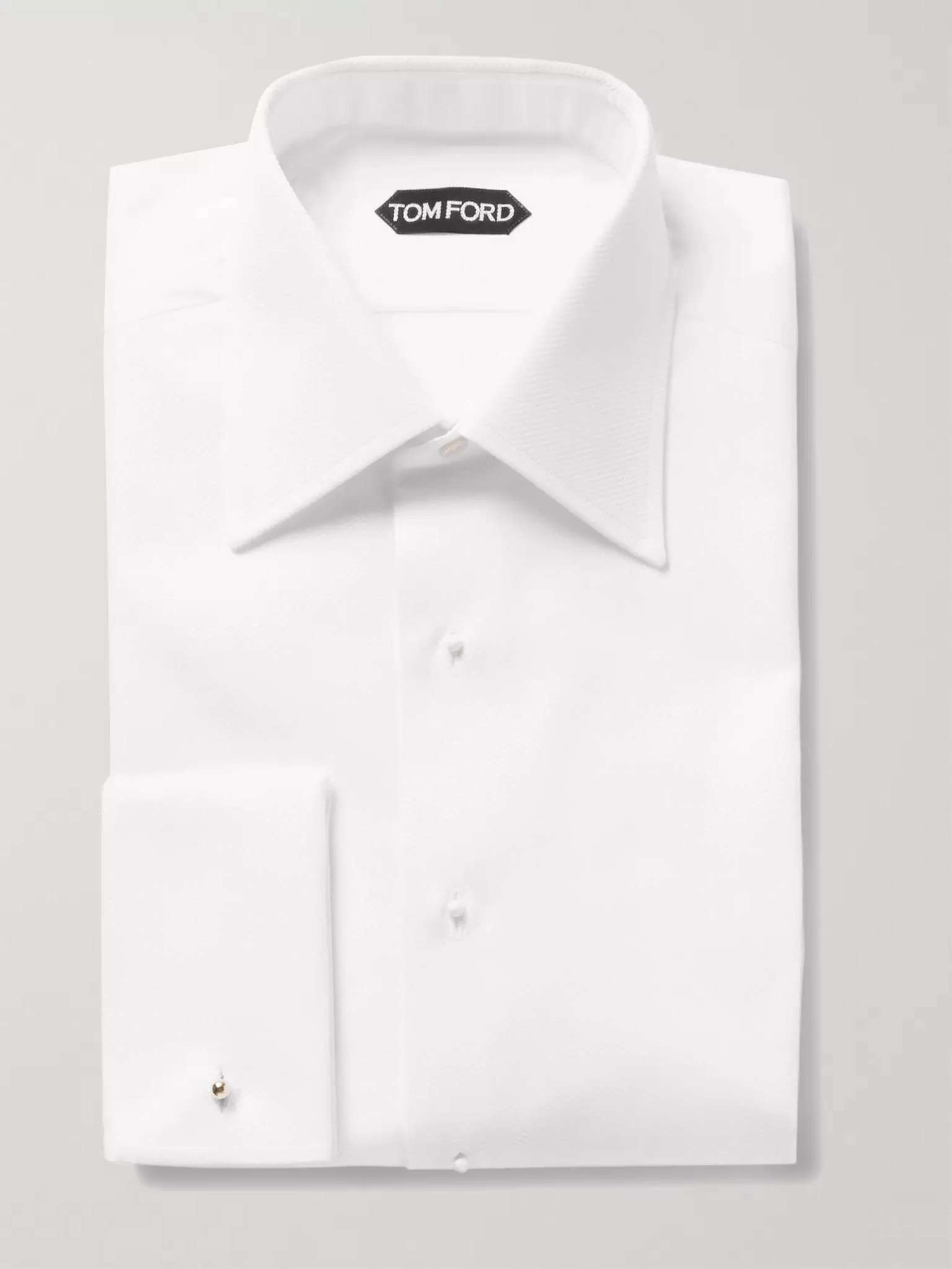 This TOM FORD bib-front tuxedo shirt exhibits the typically suave style expected of the designer. Cut in Italy from crisp, smooth cotton, its sharp piqué collar, front bib and double cuffs will elevate your formal look. Team it with a silk bow and your favourite cufflinks when the black-tie invites beckon. Shown here with Lanvin tuxedo, Kingsman shoes, Lanvin pocket square. Size & Fit - Fits true to size. Take your normal size - This shirt is designed for a slim fit - Lightweight, non-stretchy fabric - Model wears an EU 39 (UK/US 15.5) - Model measures: chest 38"/ 96cm, height 6'1"/ 185cm Details & Care - White cotton - Spread collar with removable stays, double cuffs, piqué bib - Button fastenings - 100% cotton - Machine wash - The white plastic buttons pictured are to be removed and replaced with shirt studs - Made in Italy