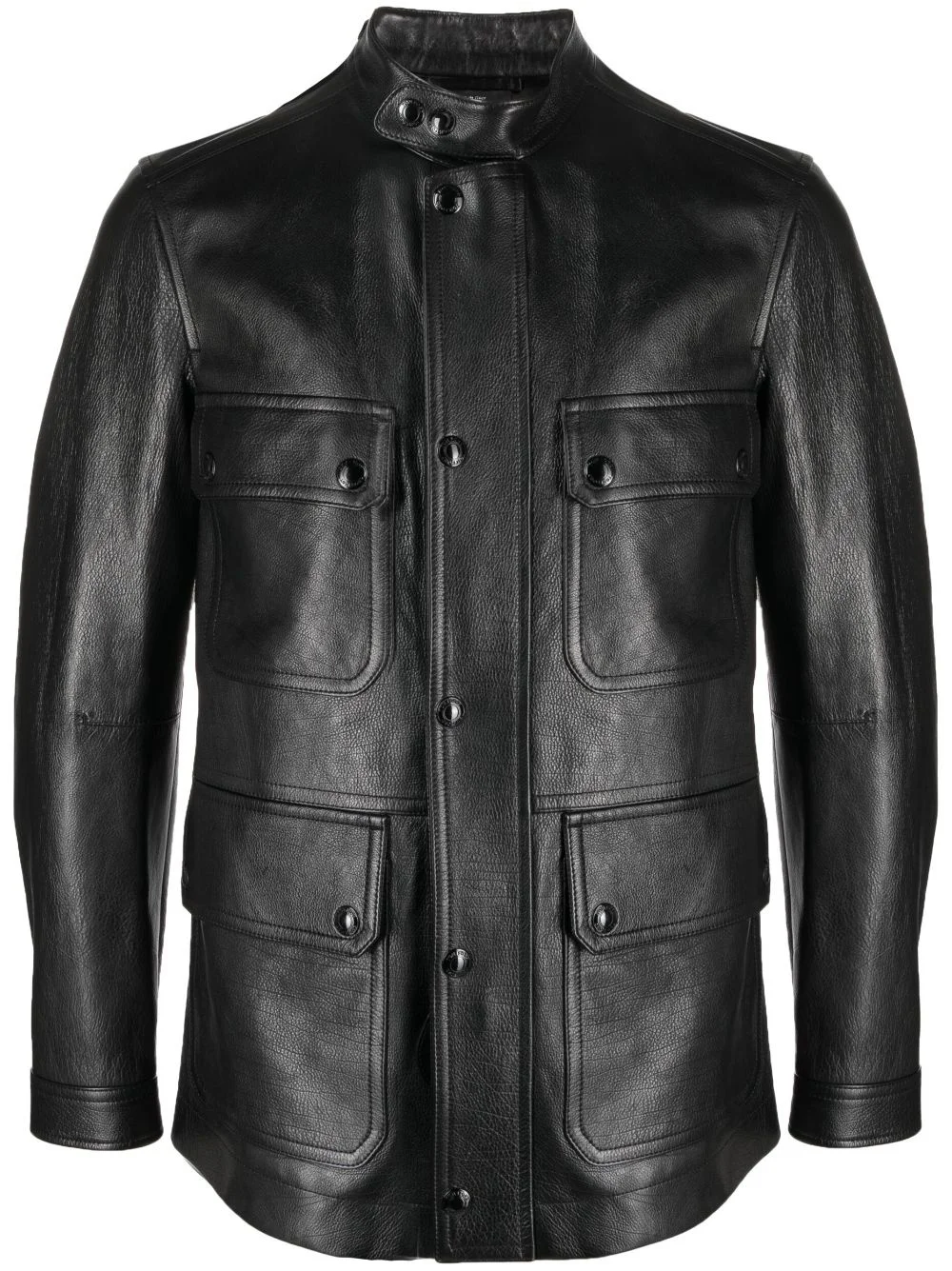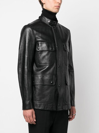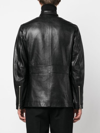 zip-up leather jacket Highlights - Black - Calf leather - Button-down collar - Concealed front zip fastening - Front press-stud fastening - Long sleeves - Cuff zips - Four front flap pockets Made in Italy Composition Lining: Cupro 60%, Cotton 40% Outer: Calf Leather 100% SIZE & FIT Model measurements Height 6 ft 1 in(1.85 m) Bust/Chest 35.43 in(90 cm) Hips 35.82 in(91 cm) Waist 27.55 in(70 cm) FittingInformation Designed for a slim fit, offering a comfortable fit that sits just away from the body Firm leather offering little flexibility to maintain its durability and sturdiness This piece fits true to size – take your usual size Washing instructions Specialist Cleaning