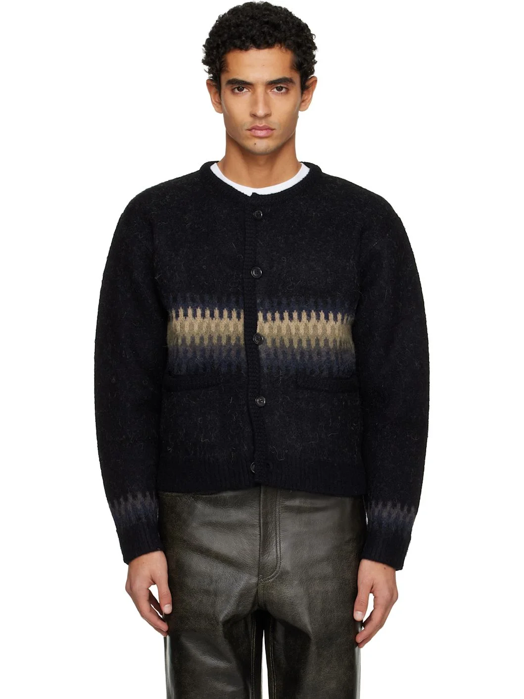Brushed knit nylon- and alpaca-blend cardigan. · Jacquard chevron pattern throughout · Rib-knit crewneck, hem, and cuffs · Button closure · Welt pockets at front Supplier color: Pale black 52% acrylic, 28% nylon, 15% alpaca, 5% wool. Made in South Korea 252251M200002