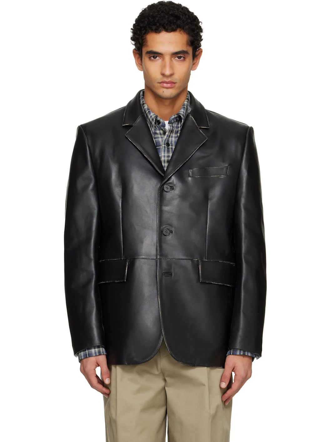 Vegetable-tanned grained lambskin jacket. · Smudging throughout · Notched lapel · Button closure · Welt pocket at chest · Flap pockets at waist · Buttoned surgeon's cuffs · Central vent at back hem · Welt pocket at interior · Satin lining Supplier color: Black Body: 100% lambskin. Lining: 50% polyester, 50% viscose. Made in South Korea 252251M181005